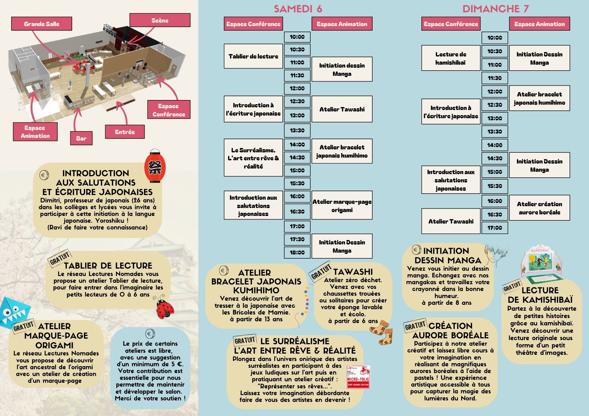 • Les Cultures Japonaises : découvrez la culture japonaise à travers des démonstrations d'art traditionnel, des dégustations culinaires, des expositions artistiques...