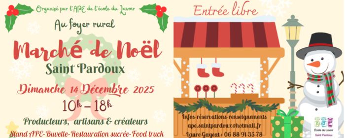 L'APE de l'école du Lavoir organise son Marché de Noël le Dimanche 14 Décembre 2025, de 10h à 18h, au Foyer Rural de Saint-Pardoux-Soutiers.
